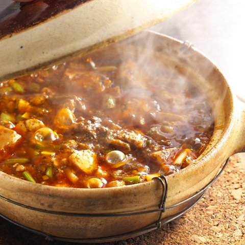 ピリリと痺れる麻辣味が心地良い麻婆豆腐。土鍋でぐつぐつと煮ていますので、熱々のうちにどうぞ。ホアジャオ(花椒)をお好みでかけてお召し上がりください。