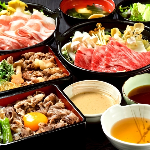 三大和牛のすき焼き重、黒毛和牛、国産の豚肉など各種ご用意。予約受付可。サラダ、香の物、逸品、ドリンクが1杯サービスでついております。【烏龍茶、オレンジ、グレープフルーツ、コーラ、アイスコーヒー】