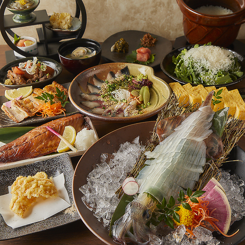 ヤリイカ活造りや藁焼きカツオのたたき、土鍋銀シャリ飯など名物尽くしの飲み放題付コースを予算毎にご用意