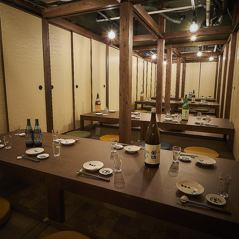 【座敷×完全個室32名収容(詰めて40名)】小上がり座敷(掘り炬燵席)の完全個室でMax40名で、人目を気にせず安心してご利用できます!貸切も3パターンあり、白暖簾付きの座敷フロアは64名収容(詰めて80名)、炉端焼きが見えるテーブルフロアは72名収容。店丸ごと貸切は136名収容(詰めて150名)。駅チカで団体利用にも便利!