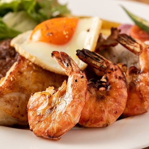 アロハカフェパイナップルの人気をすべて詰め込んだボリューム&満足度ナンバーワンプレート。ロコモコ・ガーリックシュリンプ・グリルチキンとハワイの味をたっぷり味わえる贅沢の一皿。
