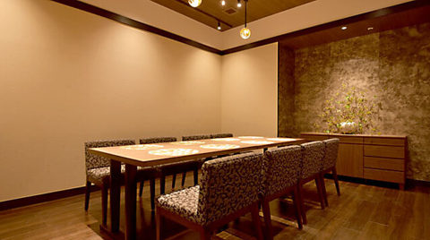 周囲を気にせずゆったりと寛げる個室は、最大8名様までご利用可能です。グレーを基調としたモダンで落ち着きのある内装は、大切な接待や会食、記念日のお祝いなど、特別な日の集まりに相応しい気品を湛えています。プライベートが守られた上質な空間で、心ゆくまでお愉しみください。
