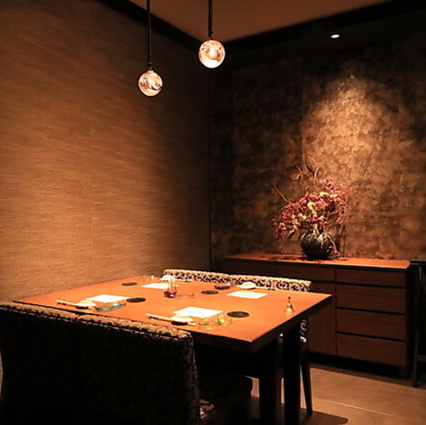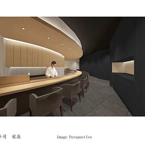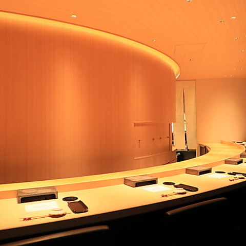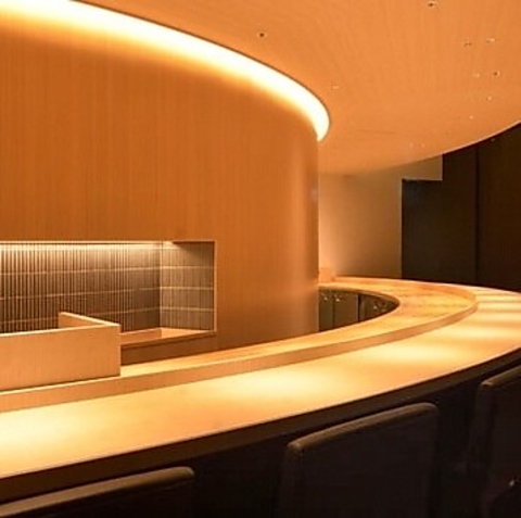店内に一歩足を踏み入れると、まず目に飛び込んでくるのは美しい円形の曲線カウンターです。すべてのお客様に等しく行き届いたサービスを提供したいという想いから設えたこの特等席では、熟練の職人が目の前でお出しする握りを堪能できます。グレーを基調とした高級感ある空間で、板前との会話も愉しめる至福のひとときをお過ごしください。