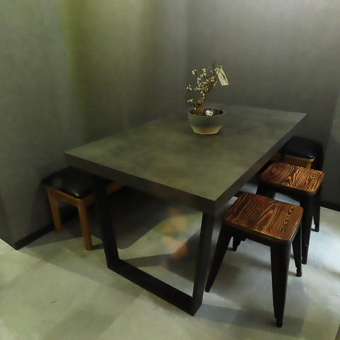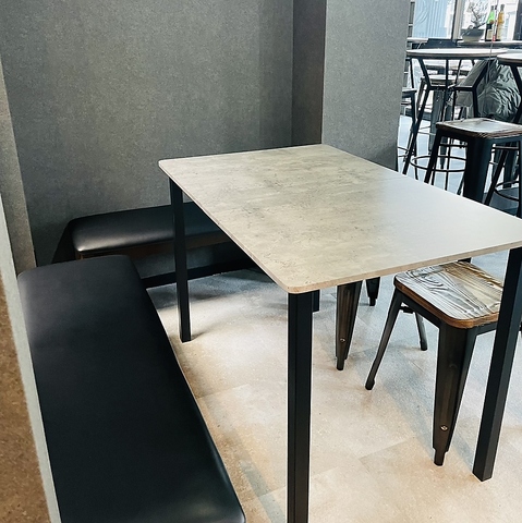 落ち着きのあるテーブル席エリアは、プライベート感を大切にしたい方にぴったりです♪柔らかなクッション性のベンチシートは、長居したくなるほどのリラックス空間を演出。テーブルに置かれた小さな盆栽風のグリーンが、モダンな内装に和のアクセントを加えています。
