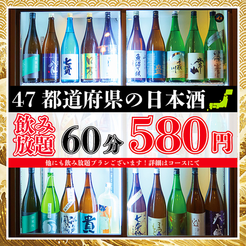 全国47都道府県の日本酒飲み放題が60分580円(税込638円)~♪旬の鮮魚や多彩な肴と共にお楽しみください♪
