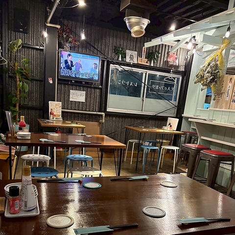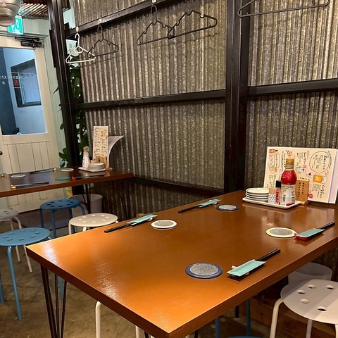 落ち着いた照明と木の温もりが心地よいテーブル席は、ゆったりと食事を楽しみたい時にぴったり。カジュアルながら温かみのある店内で、友人同士の食事や仕事帰りの一杯にも最適。肩の力を抜いて過ごせる、居心地の良い空間です。
