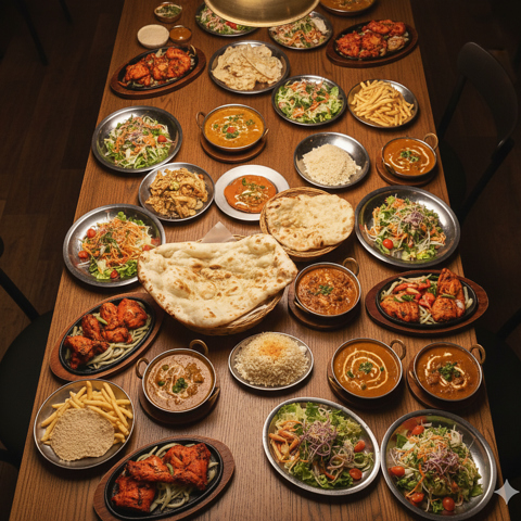 「ダブルカレーセット」をはじめ、アディティのディナーセットはボリューム満点!2種類の選べる本格カレーに、焼きたての大きなナン、ジューシーなマライティッカ、新鮮なサラダ、ドリンクまで付いた豪華な内容です。
