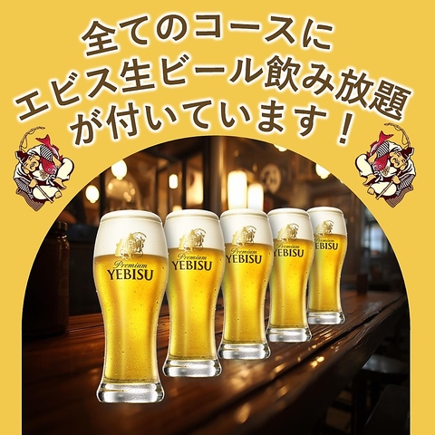 全コースにエビス生ビール飲み放題付き。料理もお酒も心ゆくまで贅沢に楽しめます。宴会に最適満足度◎必至