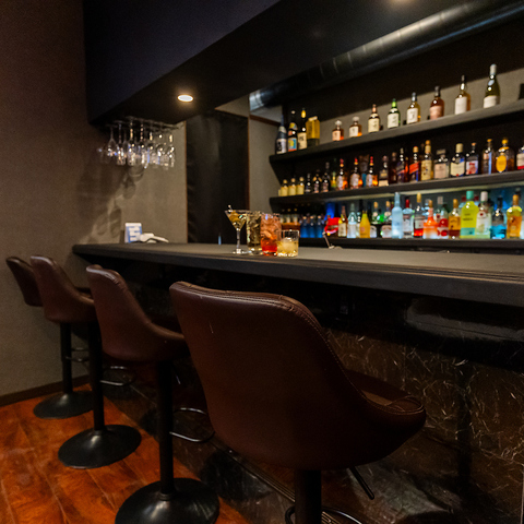 【カウンター席】お一人様からデートまで様々なシーンに利用頂いております。 目の前の数多くの酒瓶を眺めながら、一杯如何でしょうか?お洒落なボトルが並ぶ空間は、ゆったりと過ごせる特等席です。お一人様やカップルにおすすめ。お酒と共に料理を気軽に楽しんでいただけます。