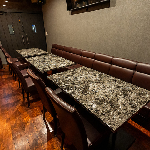 【テーブル席】静かに照らす店内は、まるで隠れ家のような落ち着いた雰囲気。デートや記念日、ゆったり語りたい女子会や少人数飲み会にぴったり。まわりを気にせず、お酒と食事をゆっくり味わえます。居心地の良さと特別感を大切にした空間で、贅沢な時間を楽しめる。