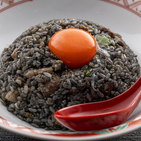 見た目のインパクト大!黒いご飯に鮮やかな卵黄が映える、当店オリジナルの「極・BLACK炒飯」