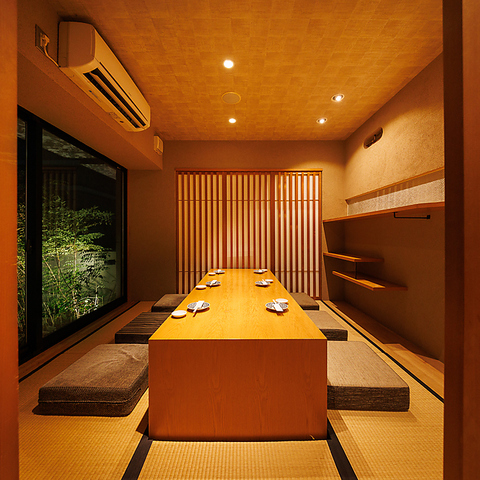 障子越しに差し込むやわらかな光と、揺れる緑が心地よい雰囲気をつくり出す個室空間!仲間やご家族とのお食事、特別な日にもピッタリ!自然を感じながら過ごすひとときは、居心地の良さもひとしおです!