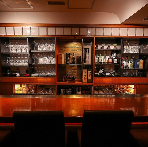 【カウンター席】琥珀色の照明が美しく反射する、全7席の落ち着いたカウンター席です。職人の手仕事が光る銘酒やビンテージワインを片手に、お一人で贅沢な時間に浸るもよし、大切な方とのデートで肩を並べて語らうもよし。栄の夜を優雅に演出いたします!