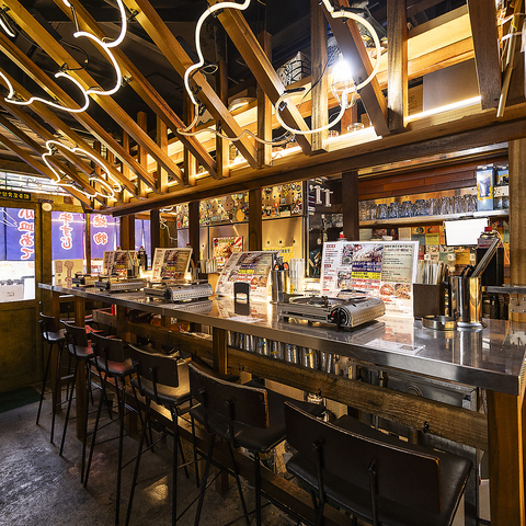 【人気のカウンター席】サク飲みや少人数にオススメです♪ネオンの煌びやかな雰囲気とワイワイとした大衆酒場の活気で楽しい時間をお過ごしください♪