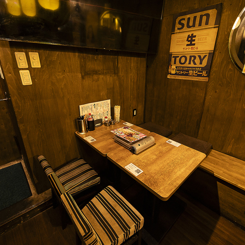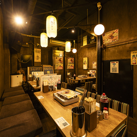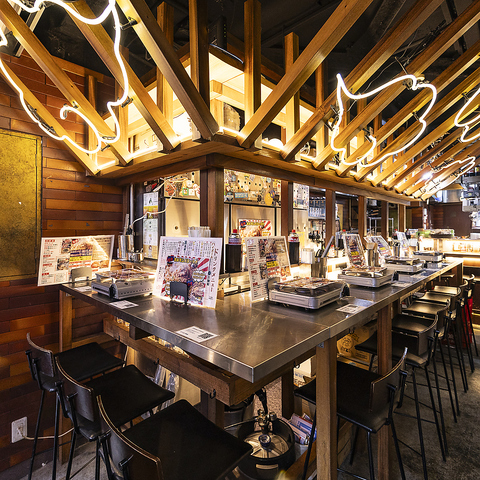 木の温もりとネオンが調和した活気ある空間。開放感のあるカウンター席で、気軽に楽しめる賑やかな雰囲気が魅力。仲間との食事にも最適です。