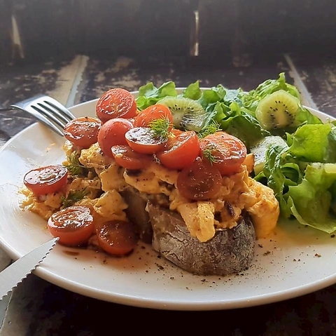 完熟トマトをたっぷり使用し、ふんわり仕上げたスクランブルエッグと合わせた、彩り豊かなトーストランチ。ジューシーなトマトの酸味と、やさしい卵のコクが相性抜群で、軽やかに楽しめる一皿です。素材の味を活かしたシンプルな味付けなので、女性同士のランチやカフェ利用にも人気。