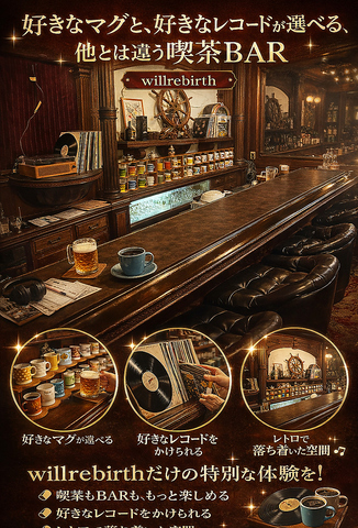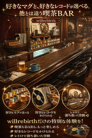 1階は喫茶BAR。その日の気分で好きなマグカップを選んで、コーヒーやお酒を楽しめます。さらに、好きなレコードを選んで店内で流せるのがWillRebirthの特徴。“選ぶ→聴く→くつろぐ”まで含めて、時間そのものを楽しめる空間です。2階ではワークショップ体験もでき、1つの建物で1日楽しめます。