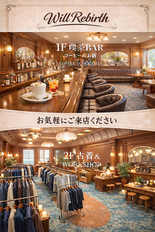 作る×くつろぐ体験店WillRebirthは「作る時間」と「くつろぐ時間」を同じ場所で楽しめるお店。2階で人気のコインリング制作などのワークショップを体験できます。1階は喫茶BARとして、コーヒーやお酒、軽食でゆっくり過ごせる空間です。体験の前後や待ち時間まで含めて“いい時間”になる導線がこだわりです。