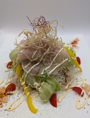 ごぼうの細切りを油でパリパリにあげて上に乗せてます。ミニトマト・パプリカ・サニクリーン・海老を使用してます。千一サラダは日替わりで内容が一部かわります