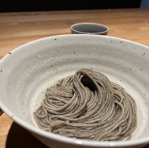 無農薬の皮付きの実を粗く挽き、甘皮も一緒に挽き込んでいます。外皮まで挽き込んだ蕎麦は、色黒く、香り甘み、粘りが豊かで、透明感のある麺に黒と白のホシが浮かぶ麺肌。モチモチとした弾力、ザラつきがありながらもつるりとした候越し。噛むほどに感じる深い味わい。他店では味わえない蕎麦をご賞味ください。