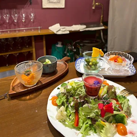 アンティークと美しい花々が調和した癒しの空間です。落ち着いた照明の下、リラックスできる雰囲気が漂います。季節の花や緑に囲まれ、心地よい時間を過ごしながら、厳選されたワインとこだわりの料理を楽しめます。ソムリエが選ぶ特別なワインを片手に、優雅なひとときをお過ごしください。