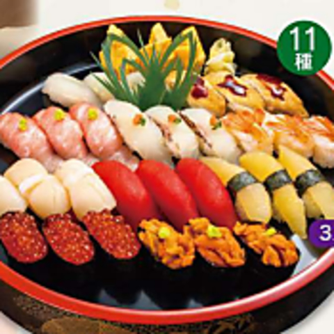11種/2人前:7776円(税込)/4人前:15552円(税抜)/5人前:19440円(税込)/本まぐろ大とろ、本まぐろ赤身、帆立貝、鮮真鯛、鮮ひらめ、数の子、ぼたんえび、生うに軍艦、いくら軍艦、煮穴子、厚焼き玉子