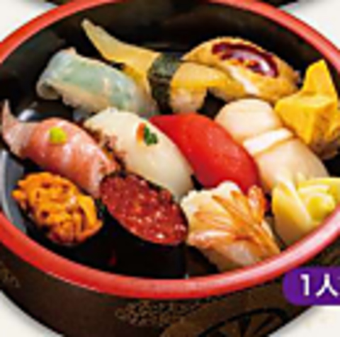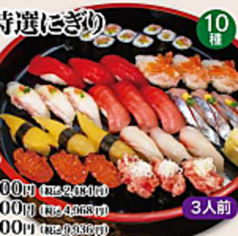 10種/1人前:1944円(税込)/2人前:3888円(税込)/4人前:7776円(税込)/5人前:9720円(税込)/まぐろ赤身、生サーモン、おすすめ白身、おすすめ光物、いか、赤えび、つぶ貝、いくら軍艦、ねぎとろ巻、厚焼き玉子