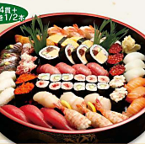 セットメニュー/約5~6人前/19種44貫+細巻2本+太巻1/2本/本まぐろ中とろ、まぐろ赤身、鮮真鯛、えんがわ、帆立貝、自家製蒸しえび、おすすめ光物、赤えび、生サーモン、いか、いくら軍艦、とびっこ軍艦、ねぎとろ軍艦、北寄サラダ軍艦、玉子握り、いなり、太巻、筋子巻、かっぱ巻