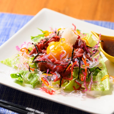新鮮な国産の馬刺しに自家製タレをかけ、卵黄とシャキシャキ野菜を絡めて。タレには玉ねぎが入っていて甘じょっぱい味わいに仕上がっています。馬刺しのまったりとした舌触りと野菜の食感が楽しい一品です。