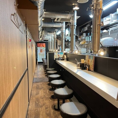 【カウンター席】少人数向けのカウンター席は、お一人様やサク飲みにぴったり。落ち着いた雰囲気の中で、程よい距離感を保ちながらスタッフとの会話も楽しめます。ダクト完備で換気性が高く、焼肉の匂いが付きにくいのも魅力。仕事帰りや女性一人でも気軽に立ち寄れる、居心地の良い空間です。