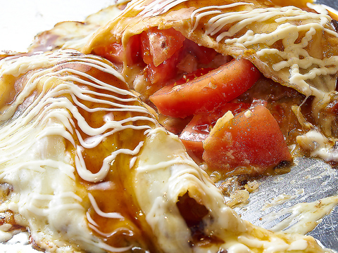 お好み焼きにトマトが入っているのは意外に感じるかもしれませんが、トマトのすっきりとした酸味と、チーズのまったりしたコクと、当店オリジナルソースの甘みが絶妙にマッチしていて、思わず美味しいと声に出してしまう自慢の一品です。ぜひお試しください。