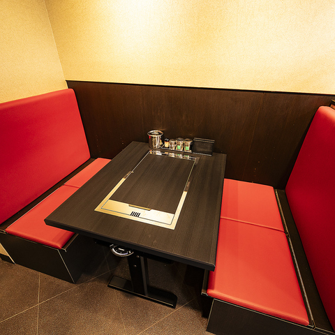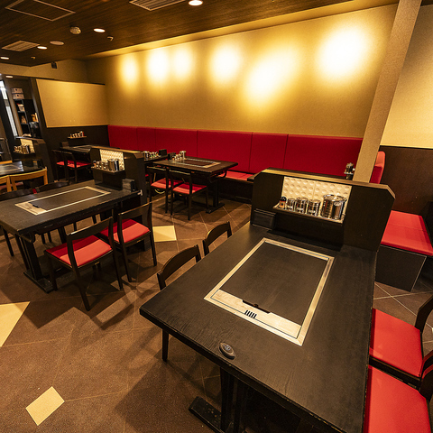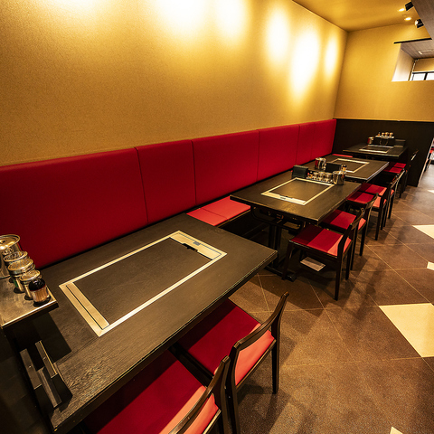 赤いシートとシックな木目調のテーブルが調和する、モダンで洗練された内装が魅力です。都会的でスタイリッシュな空間は、大切な方との会食や記念日、仕事帰りの一杯など多彩なシーンを華やかに演出。上質な雰囲気の中で、自慢の鉄板料理を心ゆくまでご堪能いただけます。