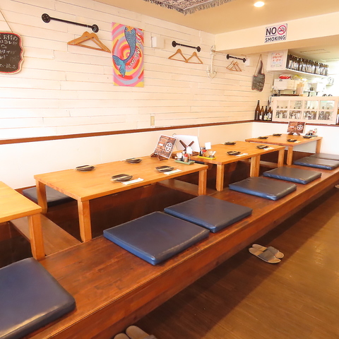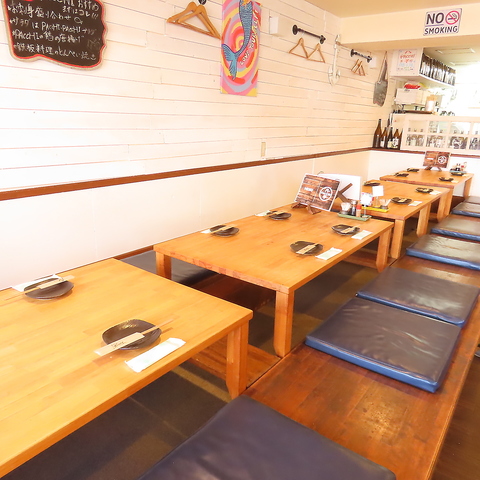 白を基調とした明るく清潔感あふれる内装です♪海の家をイメージしたデザインは、従来の居酒屋のイメージを覆すほどオシャレで開放的◎木の温もりを感じるテーブルやインテリアが配され、リラックスして過ごせる空間が広がっています。