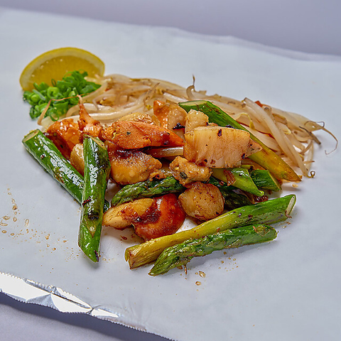 お肉料理だけではなく、海鮮や野菜メニューも充実しています。「ホタテとアスパラを濃厚なバター醤油」や本日の「白身魚のジェノバソース」はお酒も進む人気メニューです。また、旬の野菜を目の前で焼き上げるライブ感は鉄板焼きならではの醍醐味!お肉、魚介、新鮮野菜と、バラエティ豊かな食材が織りなす至福のひとときをご提供いたします。
