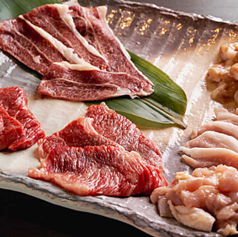 約700gのセットメニューです。 和牛上カルビ・和牛あっさりロース赤身・ハラミ・とりもも ホルモン盛り合わせ・野菜焼き盛り・あらびきポークウインナイー