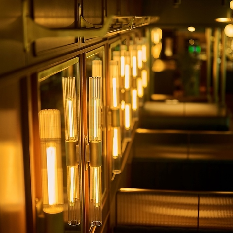 【ヨーロッパの食堂車のような空間】優雅な鉄道旅を思わせる座席を各種ご用意しております。都会の喧騒を忘れ、非日常を味わう特別なひとときを演出いたします。高級感のある佇まいは、ハレの日のお食事にもおすすめです。