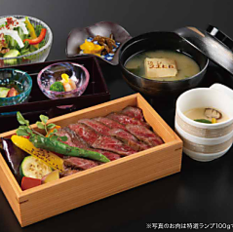ランプステーキ100g、箱小鉢、茶碗蒸、ご飯、ミニサラダ、漬物、汁物