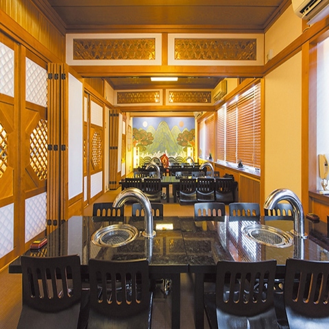 木の質感を活かした落ち着きある空間は、訪れるだけで心が安らぐ上質な雰囲気。広々としたテーブル席はグループ利用にも最適で、仕切りを活かしたレイアウトはプライベート感も確保。壁面の鮮やかな絵画が韓国の伝統美を添え、特別な時間を演出します。ゆっくりと美味しい焼肉を楽しみたい方に寄り添う、寛ぎの時間が流れる店内です。
