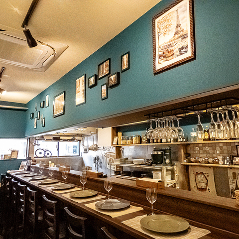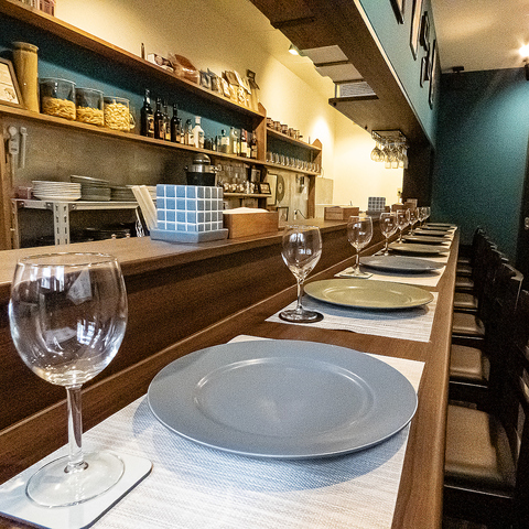 深いグリーンのカウンターで、目の前で仕上がる料理を眺めながら、まったりとした時間を。
