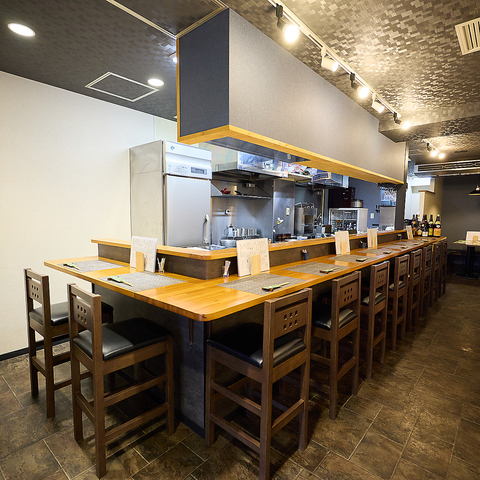 【アットホームなカウンター席】カップルやお一人様も気軽にご利用いただけるカウンター席をご用意しております。目の前には厨房が広がり、臨場感もお楽しみいただける特等席です!落ち着いた雰囲気は記念日にピッタリです◎