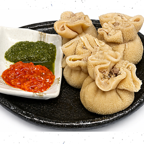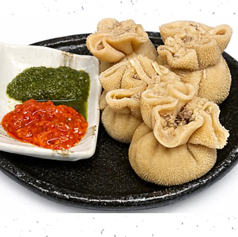 「羊の胃袋包み 肉詰め」は、スープ仕立てと2種類のスタイルで楽しめる贅沢な一品♪緑のニラの花ソースと赤のとうがらしソースで、味の変化も満喫できます。お酒との相性も抜群で、シェフおすすめの逸品です!多彩なメニューと共に、さまざまなお酒を合わせて、本場の味を心ゆくまでご堪能ください!