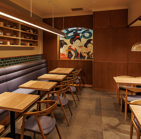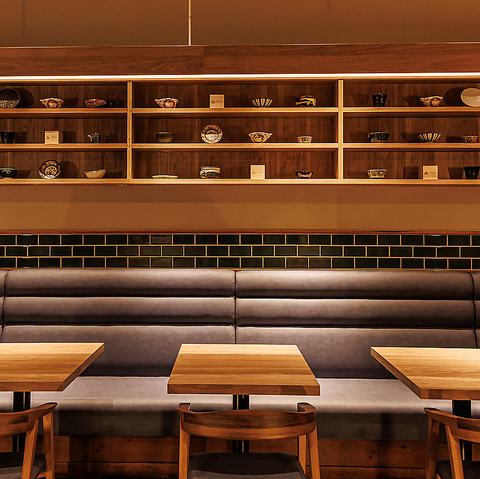 木の温もりを感じる和モダンな店内で、ゆったりと料理を楽しめるお店。落ち着いた照明と居心地の良いテーブル席で、朝ごはんや仕事帰りの一杯や友人と食事にもぴったり。気軽に立ち寄れるカジュアルな雰囲気ながら、こだわりの料理とお酒で特別な時間を演出します。様々なシーンで幅広くご利用いただけます。