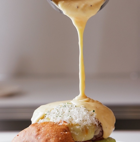 すべてのバーガーに、温かいチーズソースをかけ放題でご提供。スタッフに声をかければ、目の前でたっぷりとかけてくれるライブ感も魅力。バンズからとろけ落ちるチーズのビジュアルは、SNS映えも抜群で満足度◎!