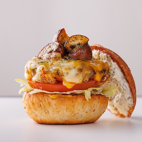 4種類のチーズを贅沢に使用した、女性人気No.1の一品。仕上げに温かいチーズソースをたっぷりかけ、さらにメープルシロップで味変も楽しめる!甘じょっぱい絶妙なバランスがクセになる、チーズ好きにはたまらないご褒美バーガーです。