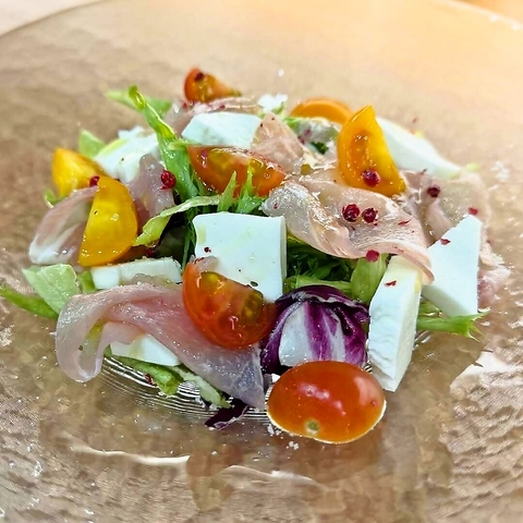 店長おすすめ★彩り鮮やかな生ハムサラダは盛り付けにもこだわっている目でも味でも楽しめる一品。塩気の効いた生ハムと新鮮なお野菜の組み合わせは相性抜群です◎もちろんお店自慢の海鮮料理にもぴったりなので、ぜひご賞味ください♪