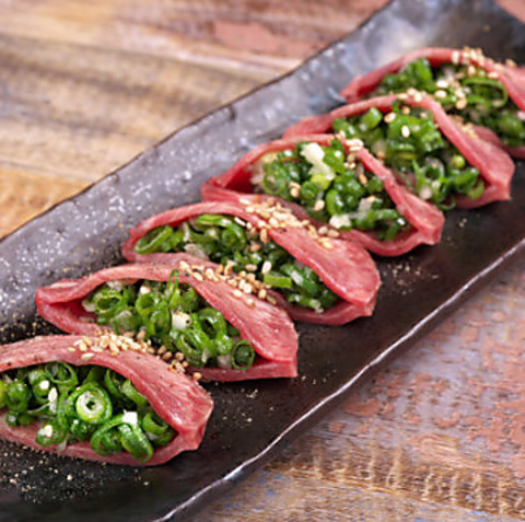 当店へお越しの際はぜひご賞味いただきたい、至高の逸品です。厳選した国産黒毛和牛のタンを使用し、独自のカットでたっぷりのネギを挟み込みました。タンの心地よい歯ごたえと、溢れ出す上質な脂、そしてネギの風味が絶妙に調和します。職人のこだわりが詰まった贅沢な味わいを、心ゆくまでご堪能ください。