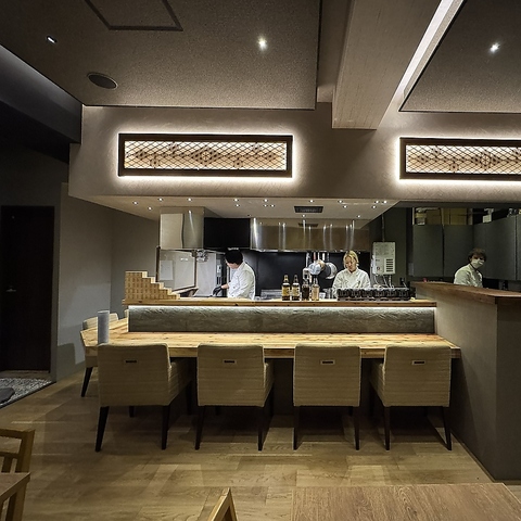 【カウンター席】大人が自然体でいられる居心地の良い当店では、お一人様やご夫婦での食事、大切なデートなどに最適です。ほんのり灯る温かみのある照明が、くつろぎの時間を優しく演出いたします。目の前では職人のこだわりが垣間見える瞬間をお楽しみいただけます。五感で料理を楽しめる特等席でごゆっくりどうぞ。