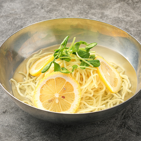 人気のレモン冷麺!レモンをたっぷり入れて爽やかな酸味を効かせた冷麺。あっさりとしてるので、ジンギスカンの〆には最適!もちろん食べ放題でも◎