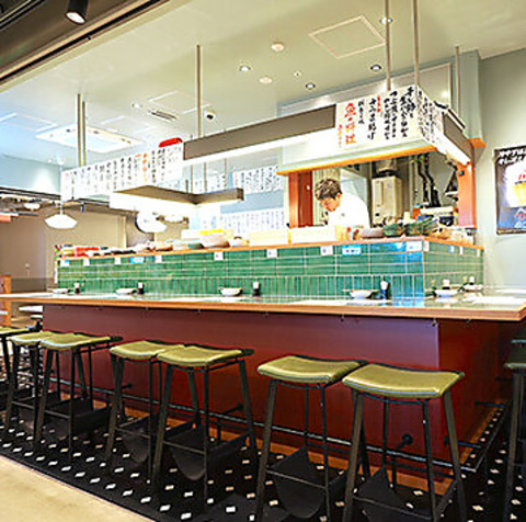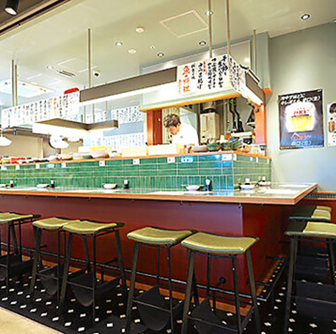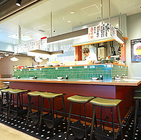 「いしもん」の醍醐味であるカウンターは全15席。職人の手捌きを間近に感じるライブ感溢れる特等席です。壁のない開放的な造りは、仕事帰りの一人飲みでも気兼ねなく立ち寄れる心地よさが魅力。おしゃれで活気ある雰囲気は、カップルでのデートにも大人気です。電車の時間調整やサク飲みなど、駅直結の利便性と共にお楽しみください。