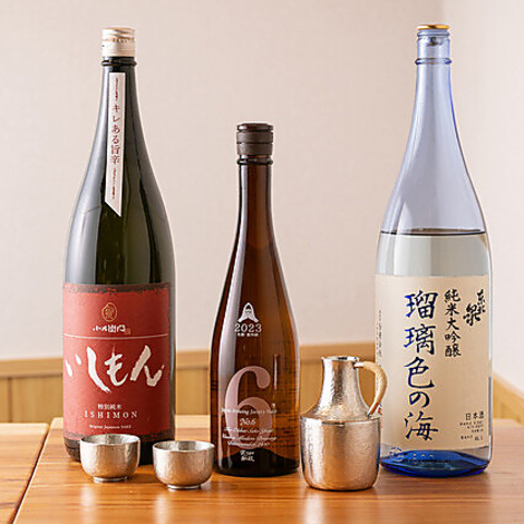 岐阜県「中島酒造」と共同開発したオリジナル銘酒『いしもん』は必飲の一杯。当店の魚料理に合うよう設計された、ここでしか味わえない特別な日本酒です。その他、季節の移ろいに合わせて全国から厳選した地酒を多数ラインナップ。辛口からフルーティーなものまで、料理を引き立てる一杯を提案します。魚と酒のマリアージュをお楽しみください。
